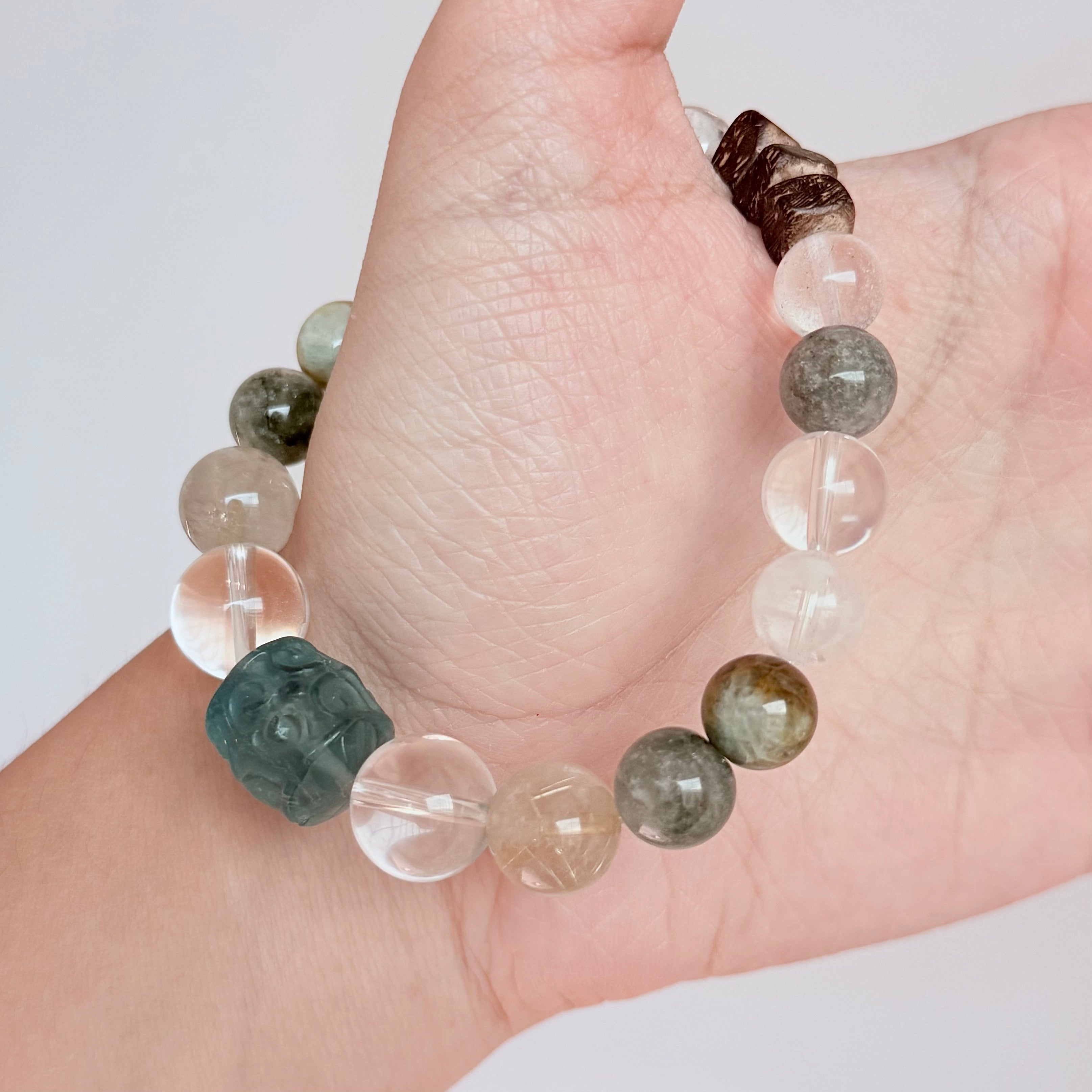 Bring serenity and abundance into your life with this handcrafted Aquamarine & Golden Rutilated Quartz Healing Bracelet. Featuring a hand-carved Aquamarine centerpiece. this bracelet radiates tranquil ocean energy that soothes the mind and spirit. It is complemented by the vibrant glow of Golden Rutilated Quartz for prosperity. the cleansing power of Clear Quartz. and the grounding stability of Green Phantom Quartz.